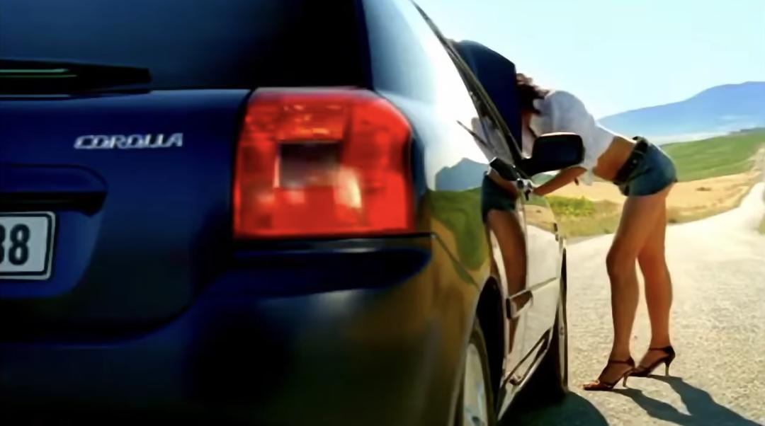 2009年的丰田卡罗拉广告里,一个身穿白衬衫牛仔热裤的金发美女站在路边一辆坏了的卡罗拉汽车旁边,美女摇着手想寻求后面车辆的帮助。