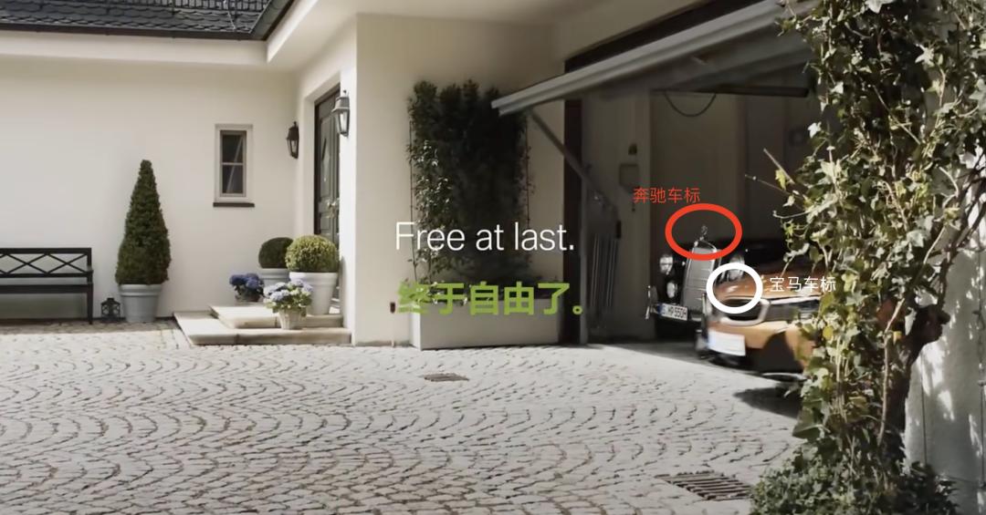 摘下工牌,在奔驰总部大楼和同事合照,挥手告别,在大家的祝福中坐着奔驰S级轿车从公司离开,窗外还一闪而过奔驰的标志,前半段视频里都相当大方地反复露出奔驰logo。
