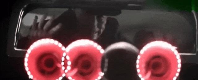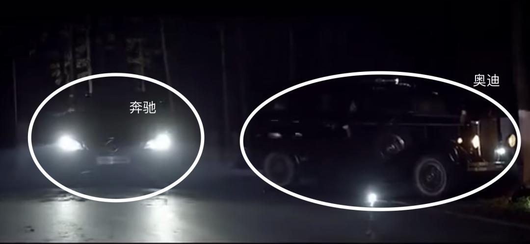 第二条,在黑夜里,挂在奥迪老爷车上的那几位男士,一手扒着车身,一手开着手电筒给车头照路,还不忘在路面上照出一个摇晃的四环logo,彰显狼狈。