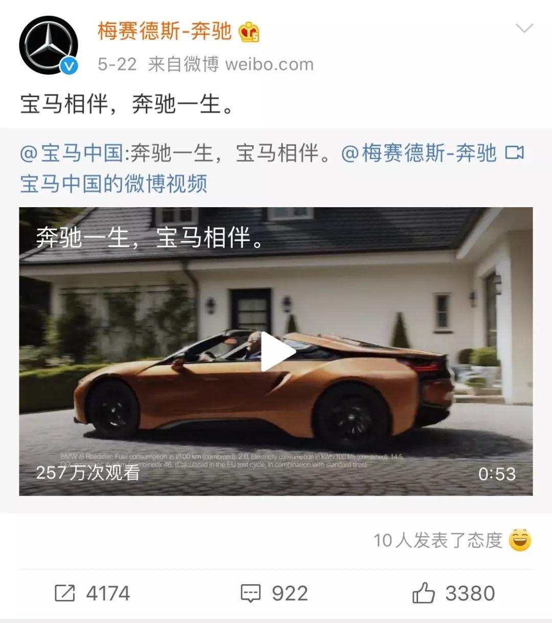 当时宝马不仅全网宣发不嫌事儿大,还在文案里明着cue了一遍:“奔驰一生,宝马相伴。”但奔驰似乎对这种互黑的广告方式习以为常了,不仅没破防,还转发助攻了一波热度,反过来回敬一句“宝马相伴,奔驰一生”。