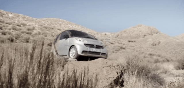 这篇广告里先是展示了奔驰smart在野外是多么地笨拙,上坡不得劲,跨障碍栽跟头,淌个水也基本淹在里面,让人一时分不清这是广告还是友商发的黑视频。