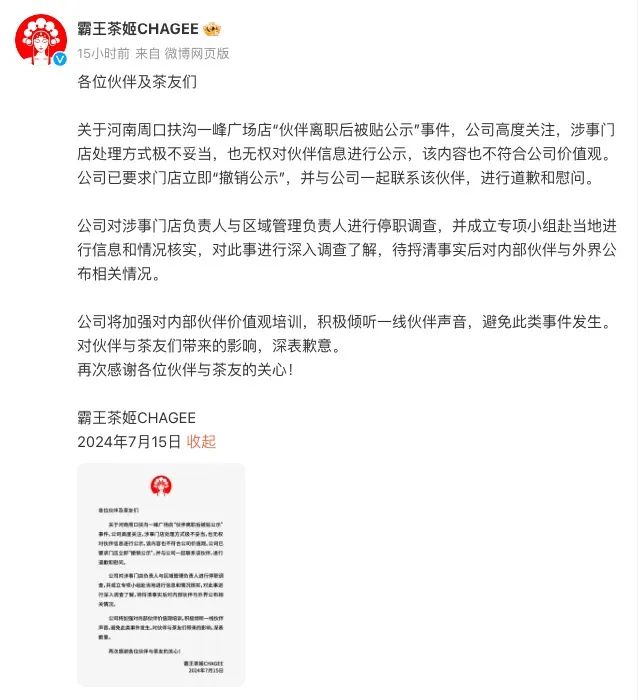 就在各路人马议论纷纷时,7月15日晚上八点左右,霸王茶姬向打工人“弯腰”了,其在微博发布说明称,关于河南周口扶沟一峰广场店“伙伴离职后被贴公示”事件,公司高度关注,涉事门店无权对伙伴信息进行公示,该内容也不符合公司价值观。公司已要求门店立即“撤销公示”,并与公司一起联系该伙伴,进行道歉和慰问。公司对涉事门店负责人与区域管理负责人进行停职调查,并成立专项小组赴当地进行信息和情况核实。