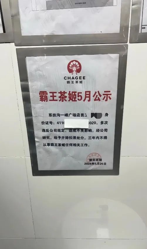 公示的内容是:“扶沟一峰广场店员XXX,多次违反公司规定,造成不良影响,经公司研究,给予开除拉黑处分,三年内不得从事霸王茶姬任何相关工作。”公示里还贴出了该名店员的身份证号。从女子的社交平台截图看到,她看到这张公示后联系了门店,门店称只是为了贴给督导看,只贴了1个小时。