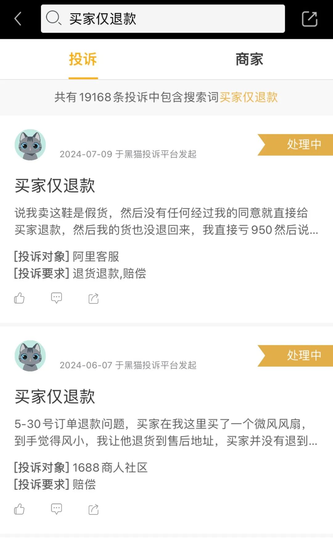 在黑猫投诉上搜索“买家仅退款”,累计有19168条投诉记录。
