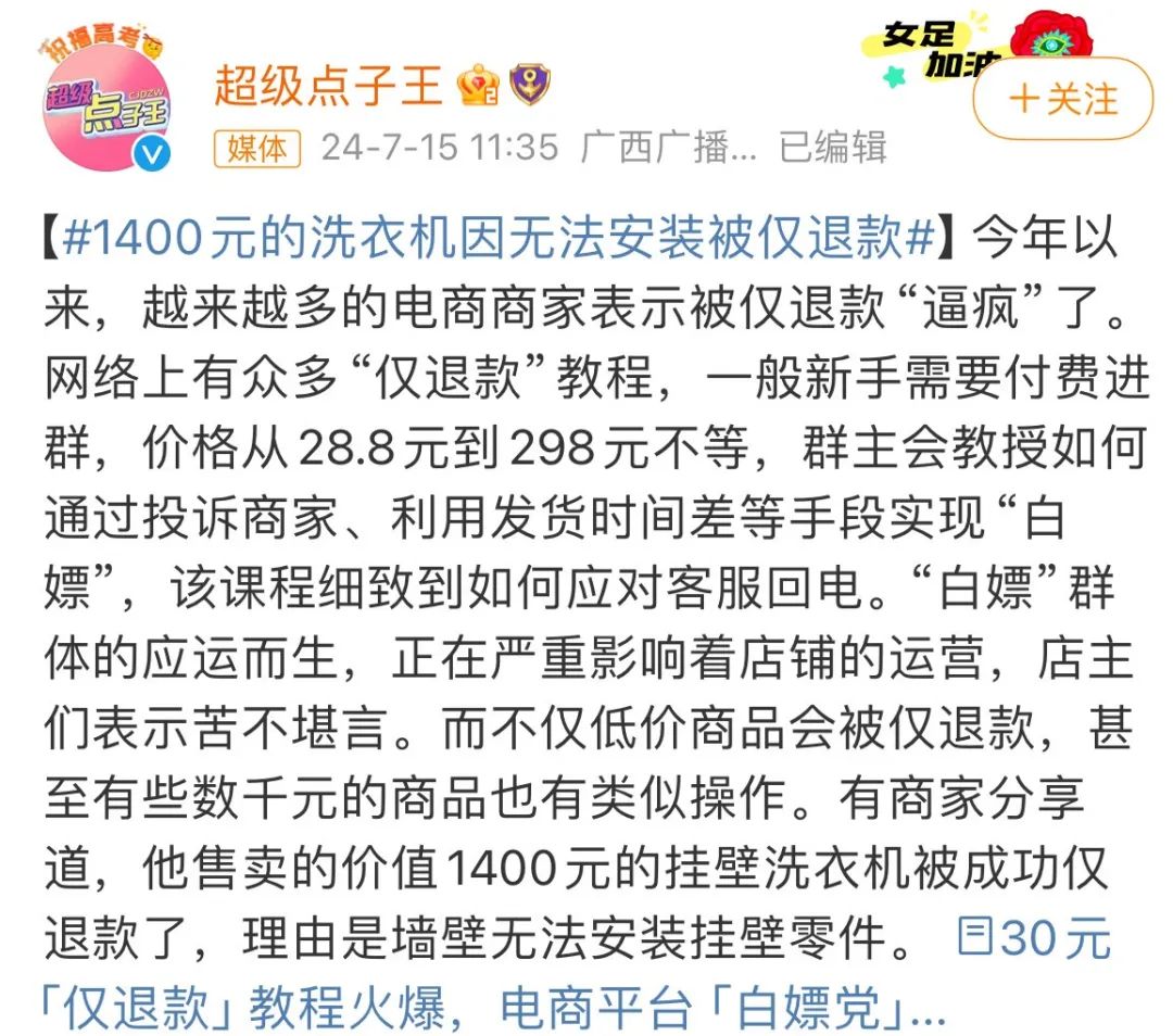 最近还有商家爆出了1400元的挂壁洗衣机被成功仅退款,理由是墙壁无法安装挂壁零件。