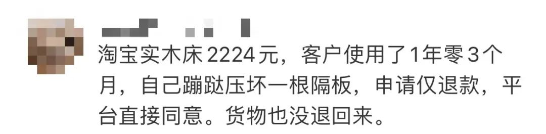 评论区还有人分享了自己,2224元的实木床在被用户使用了一年多后,被压坏了还仅退款成功。