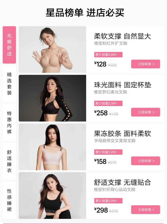 那几年,维密在大促中的排名不断靠前,这得益于其对无尺码、无钢圈内衣的发力。