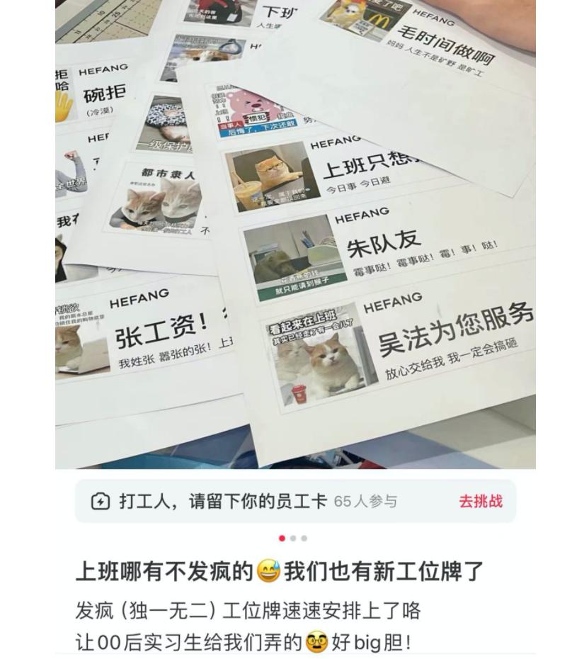 最近,“00后的工牌有种淡淡的疯感”冲上 热搜。 在社交平台上,不少年轻人将姓氏变成“陈住气”“张工资”的谐音梗 ,更改自己的工位牌,实现“爆改工位”。