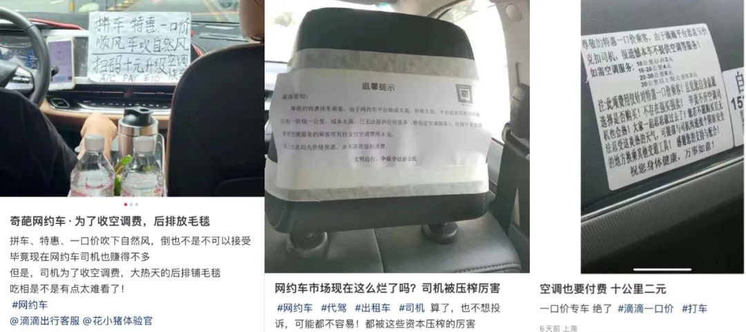 与她有相似经历的乘客不在少数。事实上,网约车司机不愿开空调的情况早在去年夏天就已经出现。且有乘客发现在某些网约车上张贴的纸条,上面明确写着,不开空调是因为平台恶意压价,特惠车、一口价等订单乘客想要享受空调服务,就必须另外支付费用。