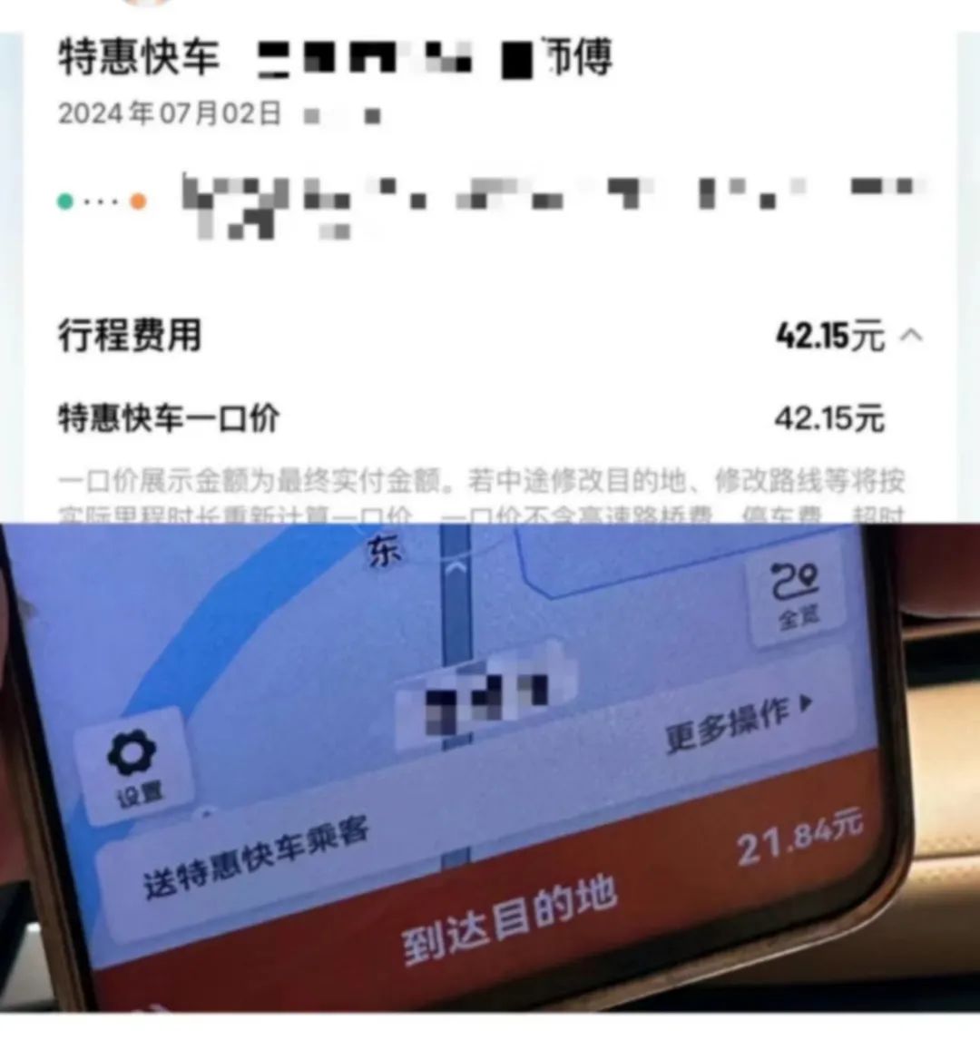 有网友在一次使用滴滴打车的行驶途中(乘客为特惠快车单)听司机“倒苦水”就想看看平台抽佣能有多离谱,于是在行程结束后拍下了司机运用界面的到账金额与自己实际支付金额做了对比,结果他支付给平台的价格为42.15元,而司机最终收到的是21.84元,被抽掉几乎一半的钱。