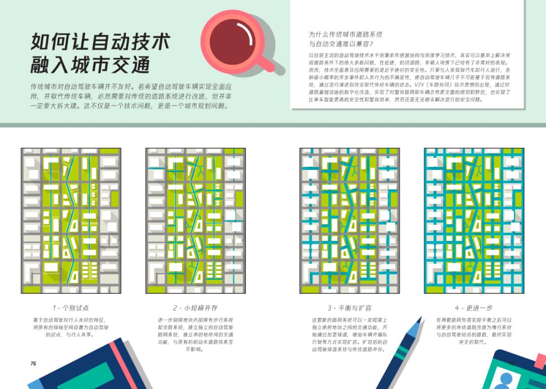但在最后几公里的末端道路,自动驾驶车辆会降低速度,与行人和慢行系统友好相处,或者直接替换为慢行交通工具和步行。这一进化过程需要城市规划的创造性想象,大幅降低高等级道路比例、密度和面积,省下的空间用来腾挪变成慢行系统和绿地系统。