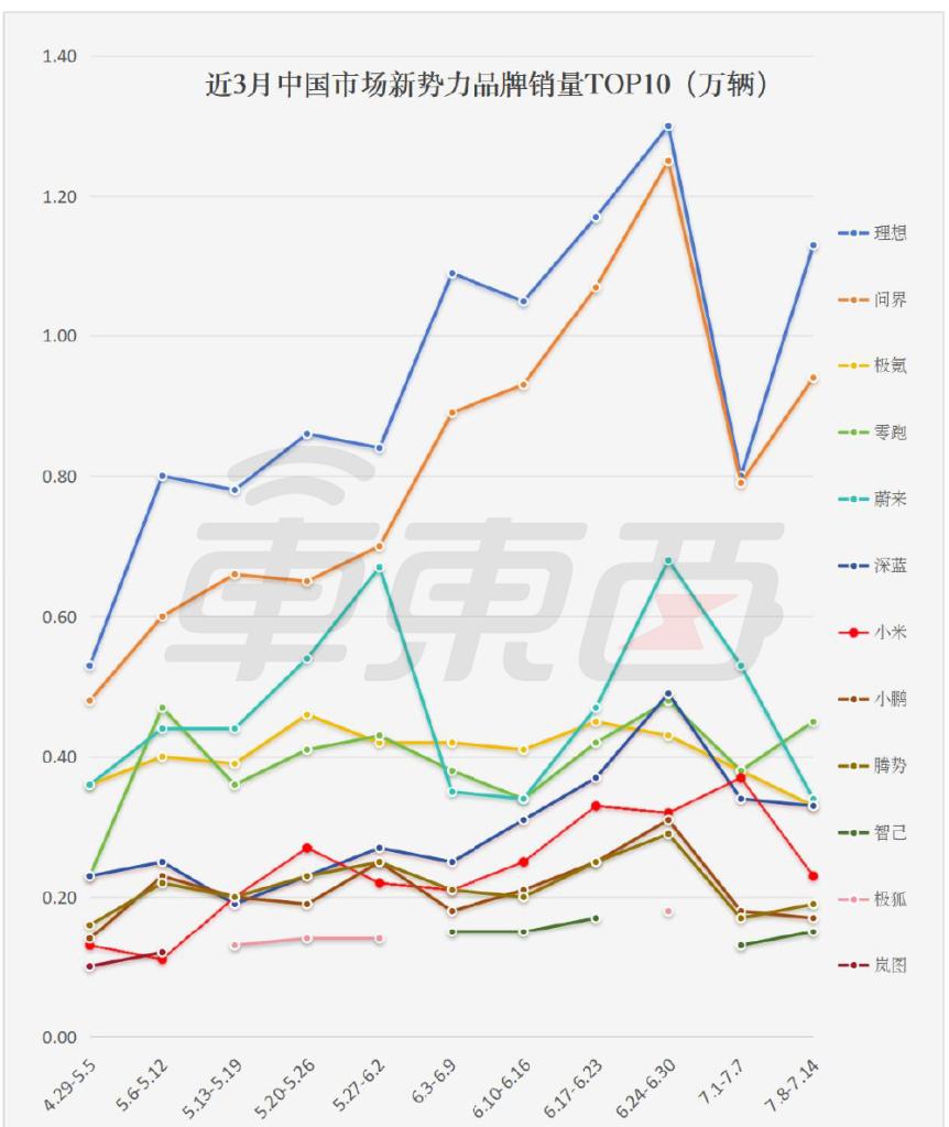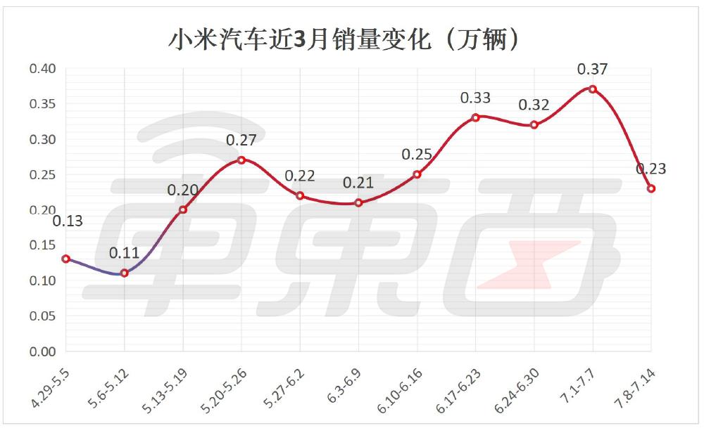 原本7月第一周,极氪、零跑、小米三家销量分别为0.38、0.38、0.37万台,小米汽车和前两者周销差距不过100台,但一周后小米汽车周销跌回2300台,相较小米7月第一周(7.1-7.7)的销量3700台,小米周销下滑38%。