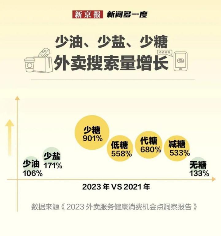 据相关统计数据显示,2023年外卖平台“少油”“少盐”“少糖”搜索激增,尤以“少糖”飙升901%最为显著。在社交媒体上,“控糖”笔记突破百万篇。