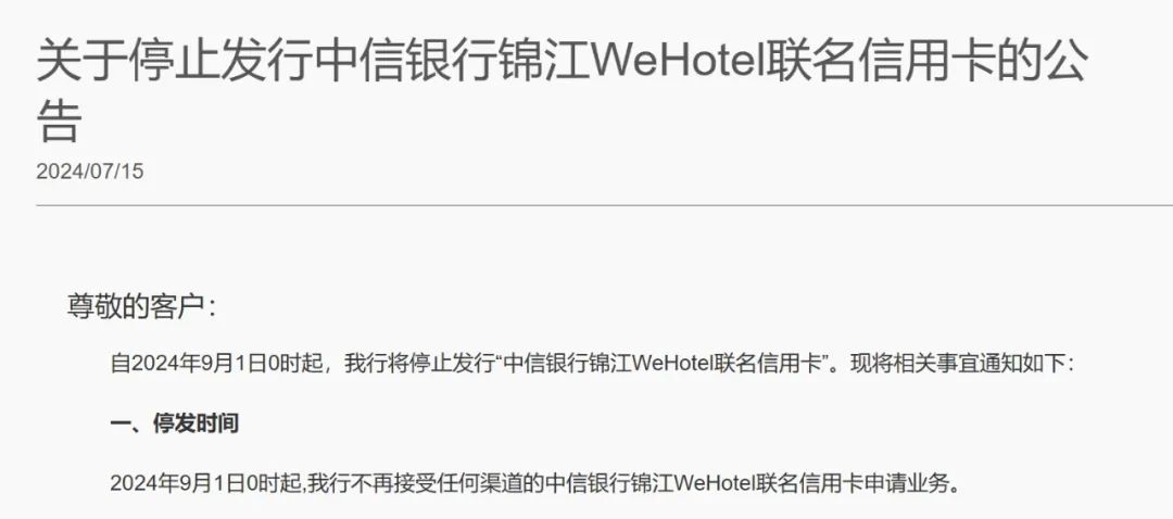 据中信银行信用卡中心7月15日公告,自2024年9月1日0时起,该行将停止发行“中信银行锦江WeHotel联名信用卡”。