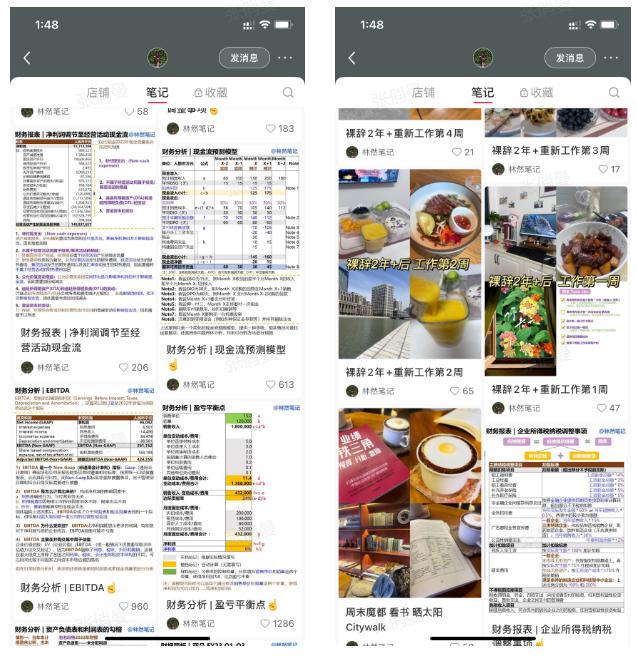 两年前从大厂裸辞的小红书用户“林然笔记”,离职期间主要更新各大公司的财务报表分析,笔记内容是密密麻麻的数据图表。