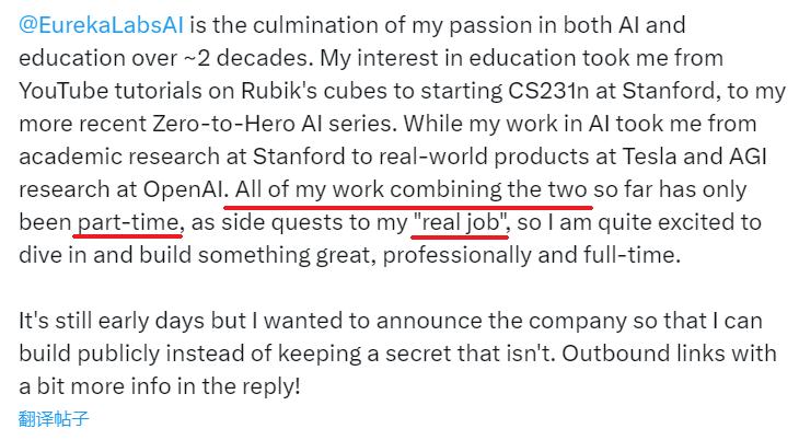 Karpathy将这家新公司视作自己20多年来,对AI和教育热情的结晶。他谈道,对教育的兴趣驱使他从线上教人玩魔方,到设计并主讲了斯坦福首个深度学习课程CS231n,再到最近推出的从零开始AI课程;而对AI的兴趣将他从学术研究带到特斯拉的产品开发,再到OpenAI的AGI研究。