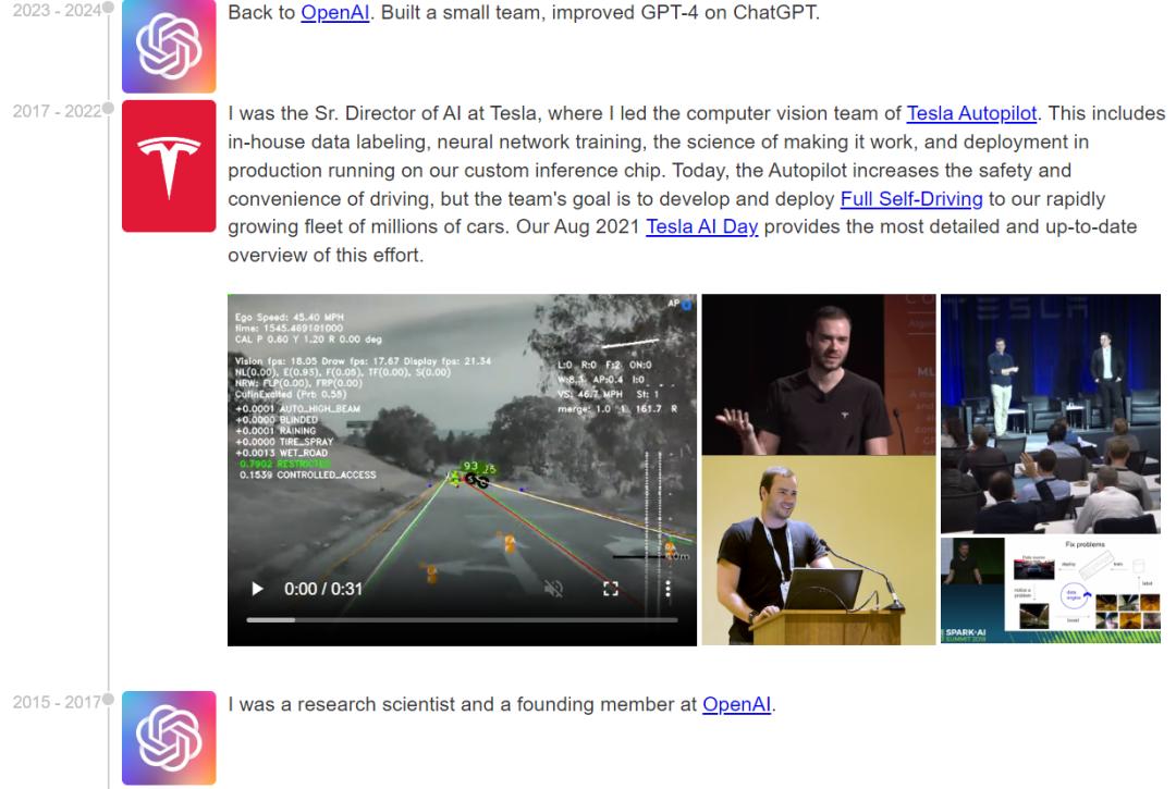 2015年,他作为创始成员之一加入OpenAI担任研究科学家。2017年,他被马斯克挖到了特斯拉,领导AI和自动驾驶视觉团队。