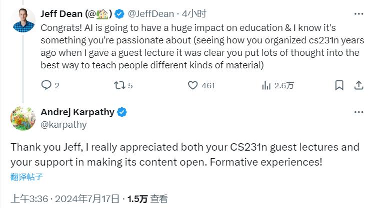 业界大佬们纷纷发来贺电。谷歌DeepMind首席科学家Jeff Dean说:“恭喜!AI将对教育产生巨大的影响,我知道这是你热爱的事情(几年前我做客座演讲时,看到了你是如何组织CS231n的,显然你花了很多心思来研究教授不同类型学生的最佳方法)。”