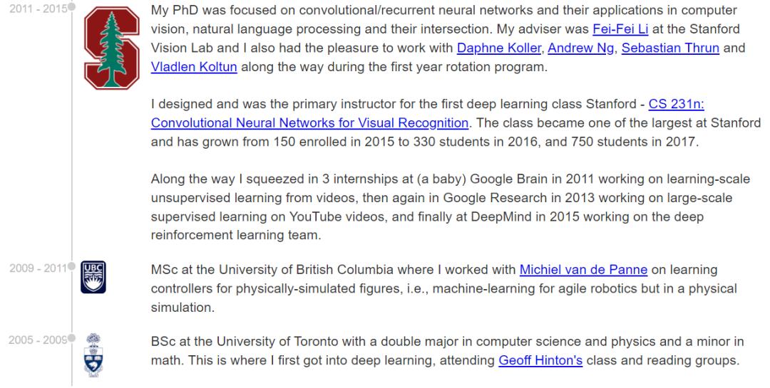 其本科、硕士分别就读于加拿大多伦多大学和加拿大不列颠哥伦比亚大学。2011-2015年,Karpathy在斯坦福大学读博,师从知名AI学者李飞飞,专注于研究卷积/循环神经网络以及它们在计算机视觉、自然语言处理和交叉领域的应用。