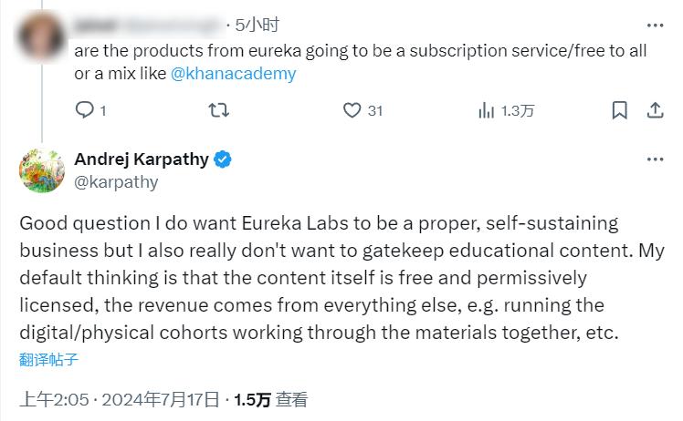 有网友问到Eureka Labs的产品会以免费还是订阅服务的形式提供。Karpathy称,希望Eureka Labs能成为一家正规、自负盈亏的企业,在他看来,教育内容本身应该是免费的,收入将来源于运营线上或实体课程等其他方面。