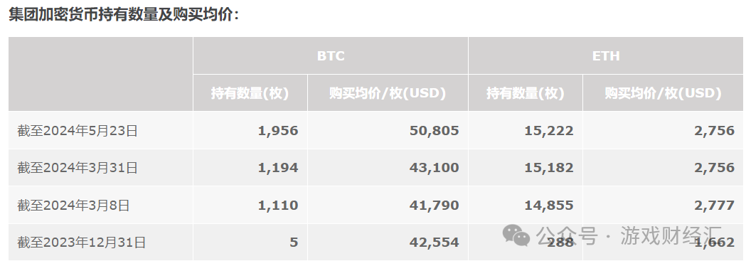 博雅互动官网显示,截至5月23日,博雅互动持有约1956枚比特币,平均成本约50805美元/枚;持有约15222枚以太币,平均成本约2756美元/枚。