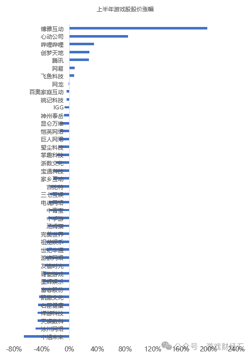 游戏财经汇整理了40家游戏股上半年的股价涨跌幅,发现: