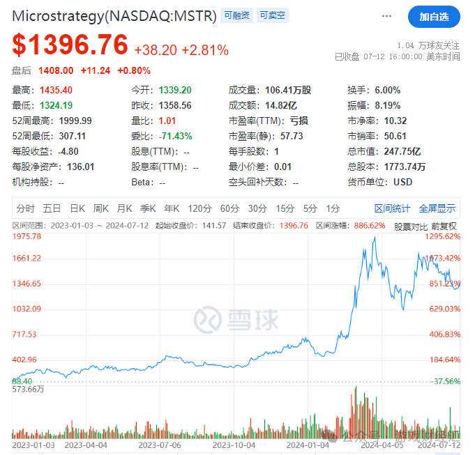 据了解,博雅互动最终想对标的是美股加密货币第一股微策略(Microstrategy)。这家公司2023年以来股价上涨了八倍多,最高市值接近400亿美金,目前市值接近250亿美元。