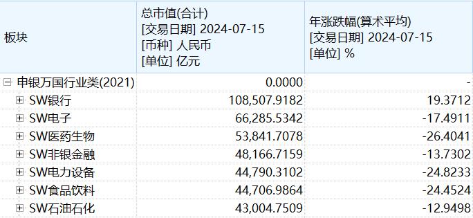 Wind显示,截至7月15日,银行板块总市值达到10.85万亿元,在31个申万一级行业中排名第一,总市值较年初增长约2万亿元,排在第二位和第三位的电子板块、医药生物板块总市值分别为6.63万亿元、5.38万亿元。