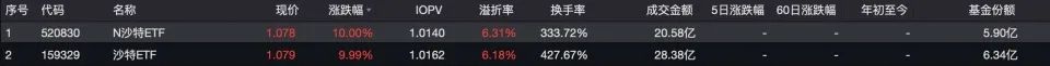7月16日,华泰柏瑞基金及南方基金旗下沙特ETF分别在上交所和深交所上市交易。当天,两只沙特ETF反响热烈,下午开盘直接封涨停板,南方基金的沙特ETF(159329)及华泰柏瑞基金的N沙特ETF(520830)分别涨9.99%及10%。