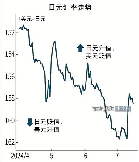 7月11日晚间,美国消费者物价指数公布后,出现日元升值、美元贬值的波动,日元汇率一度从1美元兑161日元升至1美元兑157日元,当时也有观点认为出现了买入日元的汇率干预。7月12日日元再次升值到1美元兑157.0~157.5日元区间,市场普遍认为连续几天都进行了汇率干预。