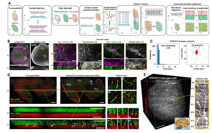 为了实现厚组织体积的精确多尺度重建,研究人员开发了一个名为UNSLICE的计算管道,即通过相互连接的切割纤维端点,链接统一相邻的切片组织,它在宏观、中观(血管)和微尺度(轴突)水平上准确地对齐解剖特征。