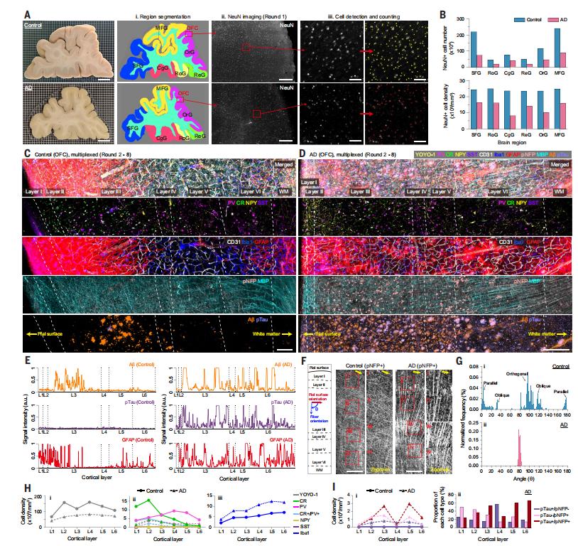 研究中,他们对两名捐献者的大脑半球进行了精细处理、丰富标记和清晰成像。经过3D细胞表型分析算法,整个样本的细胞分析结果显示,在对照组中有7,464,727个NeuN+细胞,在而AD(阿尔茨海默病)捐赠者大脑有2,890,858个NeuN+细胞。与对照组相比,阿尔茨海默病中的NeuN+细胞密度降低了46.5%(13.0×10^3/mm^3对比24.3×10^3/mm^3),这一损失比以往报告(22%至40%)更为严重。
