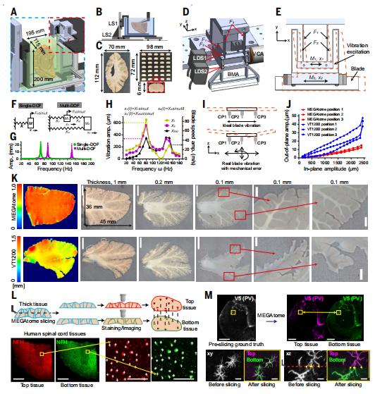为了解决这些限制,麻省理工学院的研究团队开发了一种高度通用的振动刀——MEGAtome(机械增强的大尺寸无磨损振动刀)。它能够对各种生物样本进行超精密切片,从小器官到完整的人类大脑半球和大型动物器官阵列。同时,MEGAtome能够实现高频刀片振动,振幅增加,面外振动位移低,而这些均得益于多自由度(multi - degree of)系统对刀片振动控制的优化。