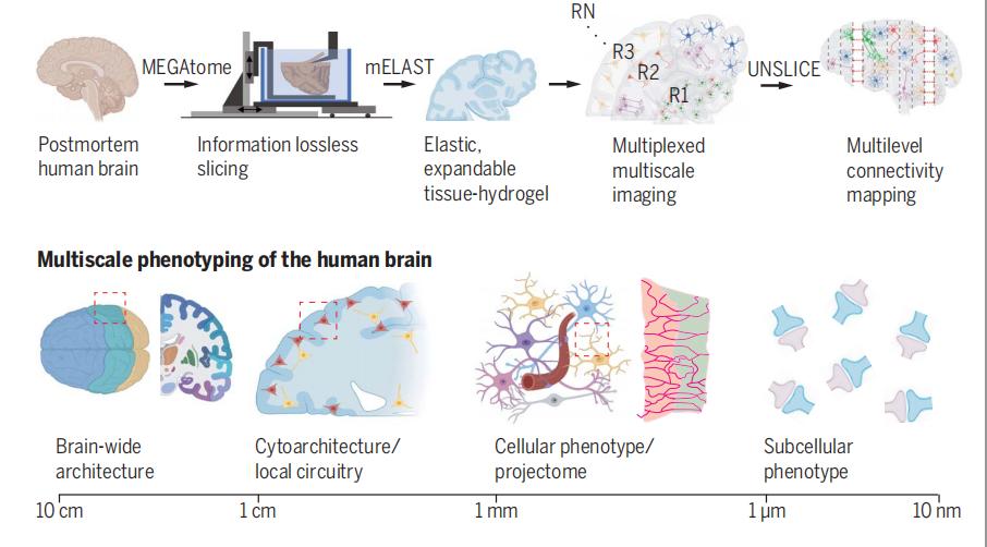 平台的工作流程包括切片、处理、标记、成像和计算拼接人类大脑组织。在磁共振(MR)成像之后,使用MEGAtome将人脑半球切成毫米厚的块。这些块经过处理并转化为mELAST组织水凝胶。坚韧、弹性且可调节大小的mELAST组织水凝胶,经过多轮标记和多尺度成像,以提取高维特征。从切割的人脑组织获得的图像使用UNSLICE管道进行计算性重整,以实现多级连接映射。