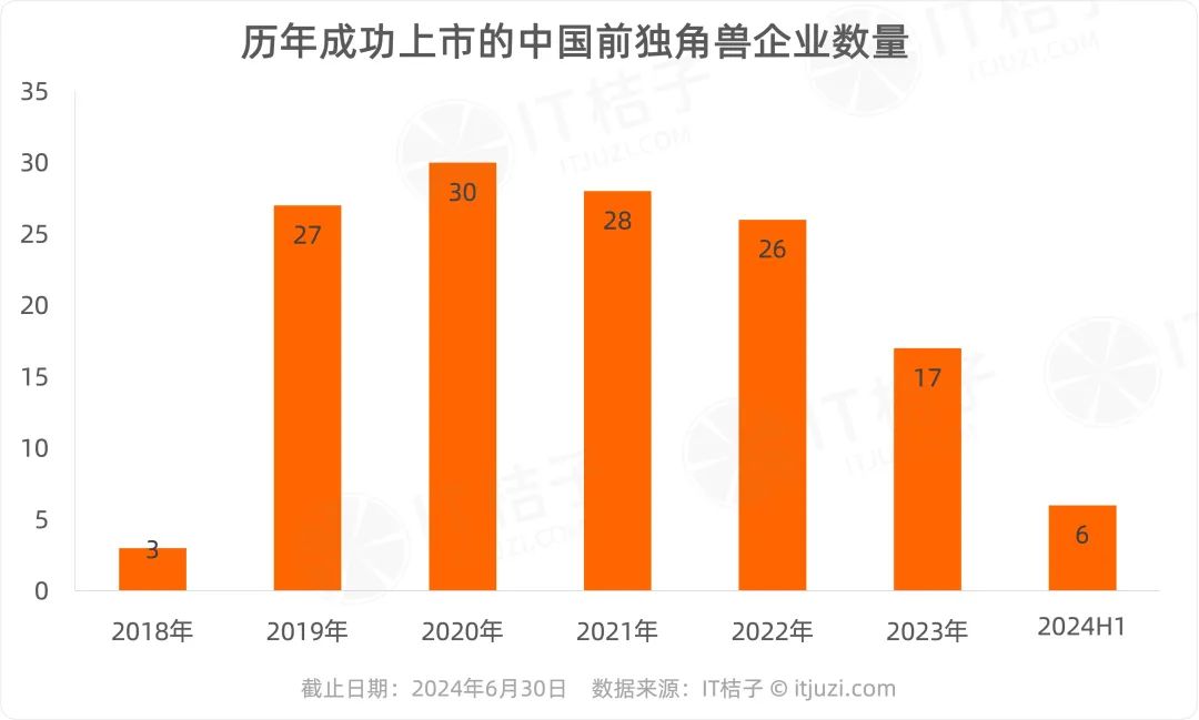 基于 IT 桔子独角兽俱乐部数据,截至 2024 年 6 月 30 日,中国有 137 家独角兽已成功上市,但 2024 年上半年国内仅有 6 家独角兽实现上市,同比减少了 14%。