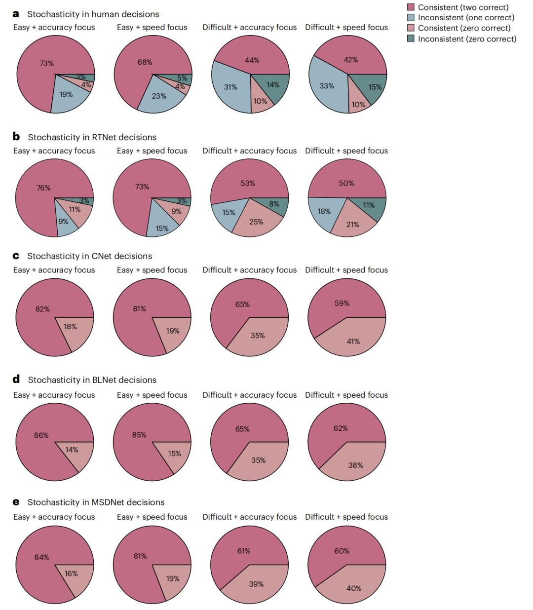 图 | 实验参与者和四个神经网络模型在决策随机性的表现(来源:该论文)