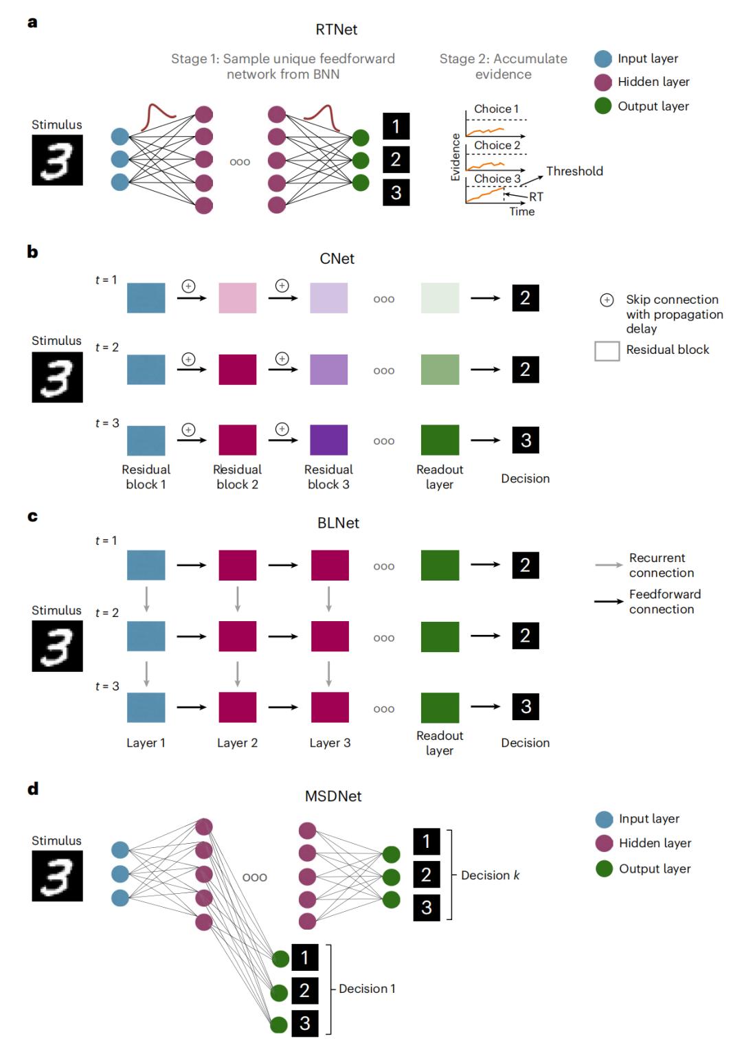 他们通过对贝叶斯神经网络进行采样,获得深度神经网络噪声权重,然后在每个处理步骤,从这些有噪声的权重分布中进行采样,来模拟神经响应的随机性。RTNet 也会积累每个选择对应的输出,直到其中一个选择达到预定义的阈值。为了验证 RTNet 能够适用于各种感知任务,并做出类似人类感知决策的一些基本特征,他们对 RTNet 进行了全面的评估测试。他们设计了 “二选一” 的决策任务,通过人为改变任务难度,来对比 RTNet 模型与 60名 参与者进行决策判断的响应时间和准确度,从而验证 RTNet 在模拟人类行为方面的出色表现。人类行为的一个核心特征就是决策具有随机性,面对同样的情况可能做出不同的决策,研究人员将人类行为与 RTNet、CNet、BLNet 和 MSDNet 的行为进行了比较。实验充分考虑了人类决策的随机性、增加响应时间带来的准确性下降、复杂度高的决策导致的准确性降低等干扰因素,来验证 RTNet 在决策上的随机性是鲁棒、可靠的。