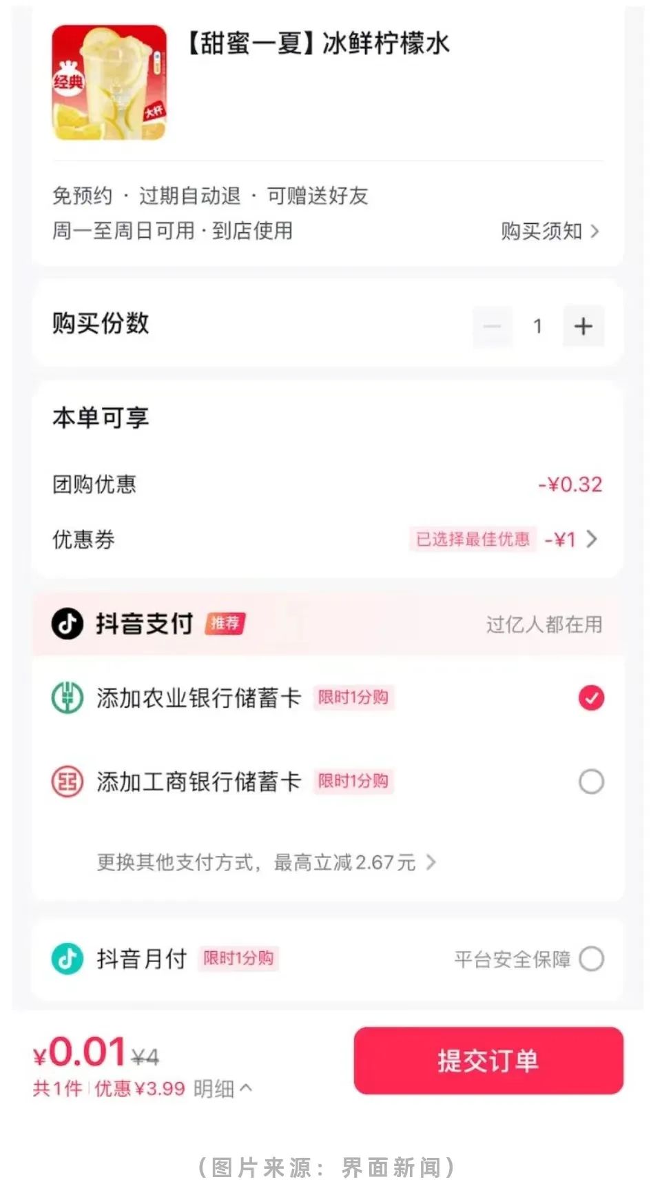 据蜜雪冰城官方账号发布,蜜雪冰城柠檬水每年卖出超过10亿杯,可绕地球近5圈,按照单杯4元计算,一款单品一年卖到40亿,很难不让其他品牌眼红。我国本身是柠檬种植大国,供应链稳定,柠檬水作为国民饮品具有良好的群众基础,面对其他茶饮品牌的挑战,蜜雪冰城也给出了正面反击,在各种渠道放出了优惠券,折扣后价格甚至低至0.01元一杯。