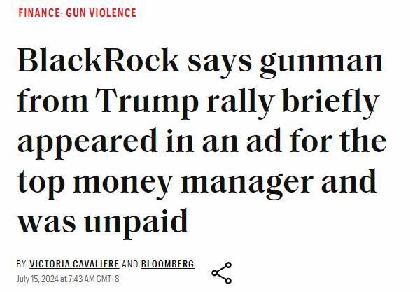 只是现在美国大选情况波谲云诡,贝莱德的多位前高管,在拜登政府内担任白宫国家经济委员会主任、财政部副部长等高官。而此次涉嫌刺杀川普的嫌疑人Thomas Crooks曾出现在贝莱德的广告中,虽然贝莱德随后将这个广告下架,