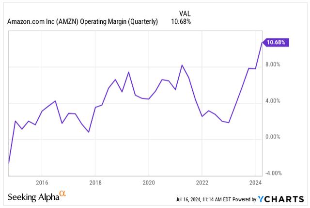 如果你仍然质疑亚马逊股价升值的原因,请考虑一下亚马逊网络服务(“AWS”),其增长率为17%,独自贡献了94亿美元的营业收入,占总收入的61%。在深入探讨AWS的成功之前,利润率一直是亚马逊本季度的亮点,其营业利润率超过10.7%,并且在接下来的几个季度还有进一步增长的潜力,进一步增强了“效率之年”的可行性。