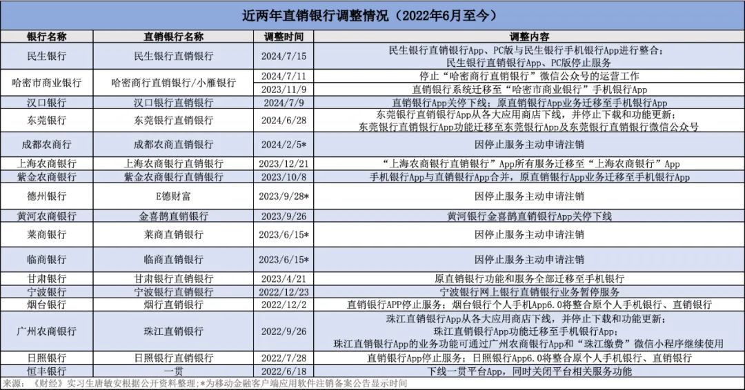 至此,中国首家发起设立直销银行的全国性股份行,自2021年启动撤销总行直销银行事业部、App停止运营起,历时三年完全退出直销银行业务领域。据《财经》不完全统计,近两年来,已有至少17家银行宣布对直销银行渠道进行调整,或直接停止服务,或将相关功能整合至手机银行App。