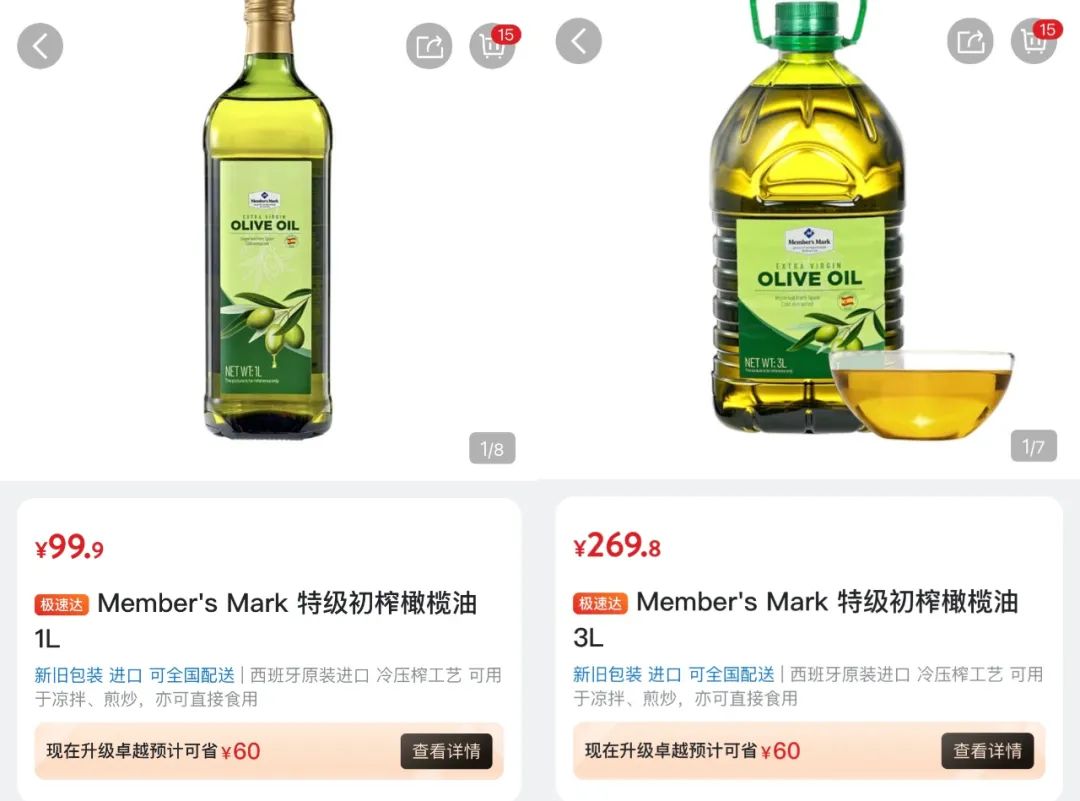 小食代留意到,上述被网友称为“价格刺客”的两款橄榄油均为山姆Member’s Mark自有品牌产品,强调“西班牙原装进口”、“冷压榨工艺”、“可用于凉拌、煎炒”等卖点,目前在山姆APP上售价分别为99.9元和269.8元。