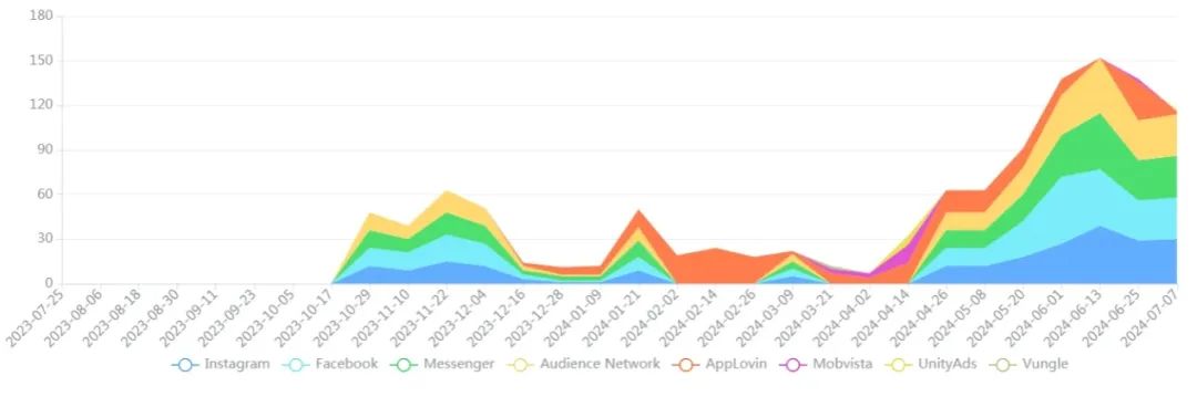 「Idle Outspot」在 iOS 端的素材创意数量从2024 年 5 月下旬开始快速上涨 | 图片来源:广大大