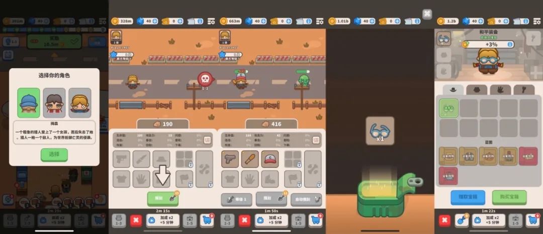 游戏的主线是模拟经营通关来开拓地图,差不多在第 4 张地图(飞机残骸)的时候,基于末日生存的设定,引入“打丧尸”的玩法,而打丧尸过程中则核心使用装备开箱玩法来拼数值的设计,一是通过开箱玩法推高流水、二是战斗奖励是“和平装备”(提升模拟经营部分的收益与效率)来连接 2 部分玩法(详细的游戏循环下面展开说)。