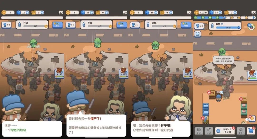 之后游戏开始介绍放置模拟经营玩法。和其它同类竞品一样,玩家首先需要花费游戏内货币“硬币”来建设一个生产商品的装置。这时候基地开始有“顾客”(其他幸存者)拜访,主角会自动根据顾客的需求前往装置,花费一段时间制作商品,然后再卖给顾客,从而得到硬币收入。从生产到销售的过程完全自动。