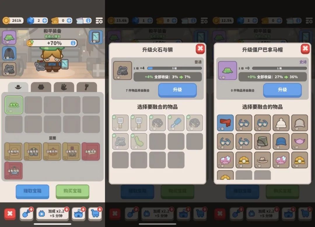开箱奖品也设计得比较巧妙,其中和平装备更是和模拟经营直接相关,能提升基地收入。因为每一个地点的前期经营收入增长都很慢,除了看广告换取短时间的 2 倍收益之外,和平装备带来的增长就能有效缩短通关时间,给了玩家去开箱和内购(买铲子开箱战斗装备)的直接动力。此外玩家还能把加成效果弱的和平装备合成,用来产出加成效果更好的装备,让玩家挑战 Boss 开箱出的一些低等级物品不会浪费。