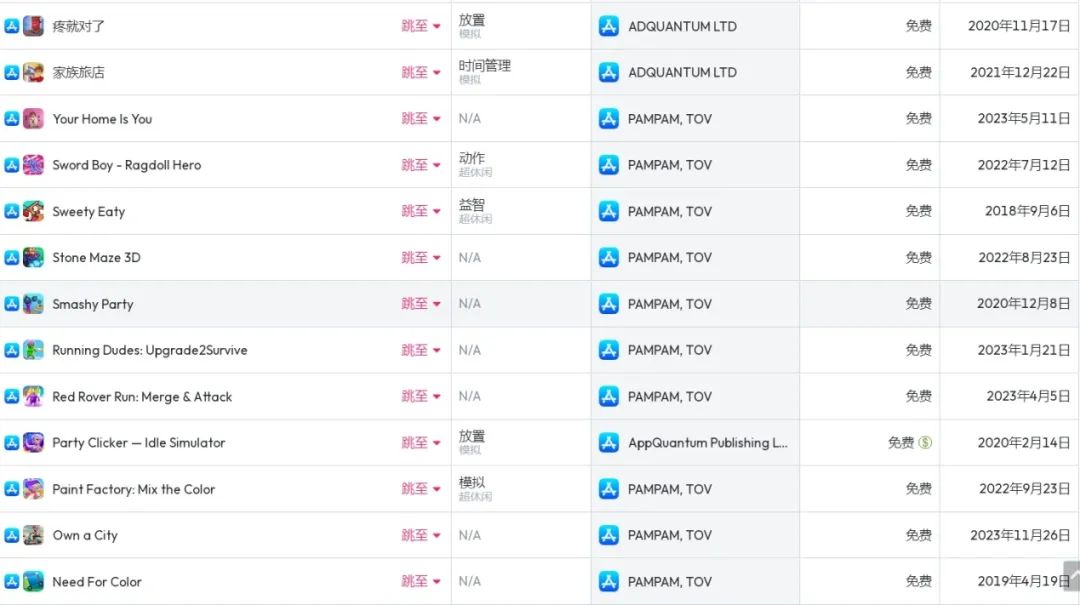 data.ai 的数据显示,AppQuamtum 还和一个名为“TOV PAMPAM”的发行账号相关。该账号发行的产品主要集中在 2020 年之前,大部分都是超休游戏。