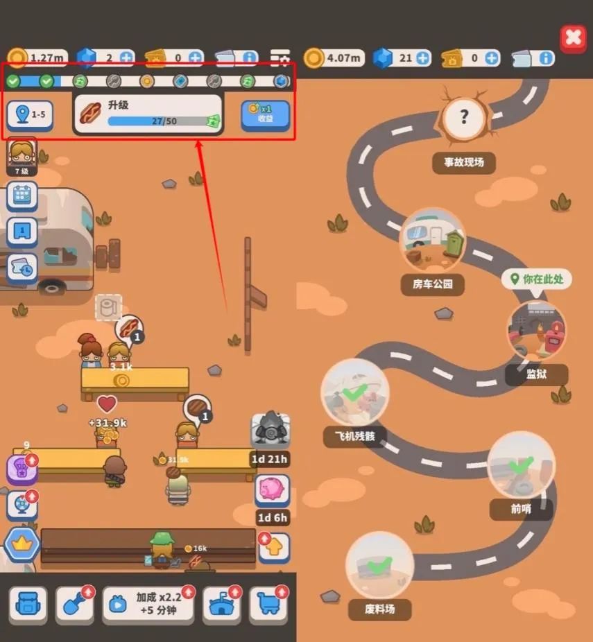 完成各种给定任务(左 1 红框圈出),前往下一个地点,是游戏的主线 | 图片来源:Idle Outpost