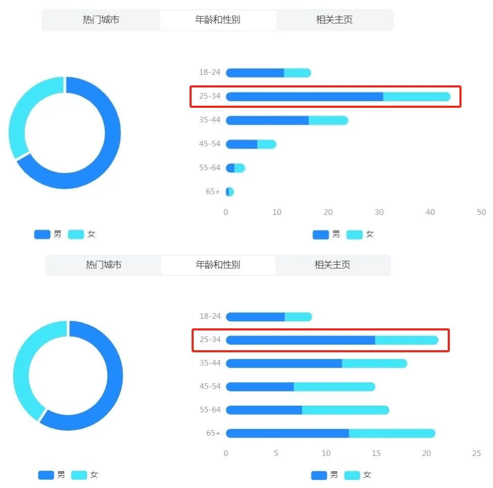 “放置游戏”和“末日生存游戏”在 Facebook 上都很受 25-34 岁年龄段用户欢迎,其中“末日生存游戏”的受众面更广 | 图片来源:广大大
