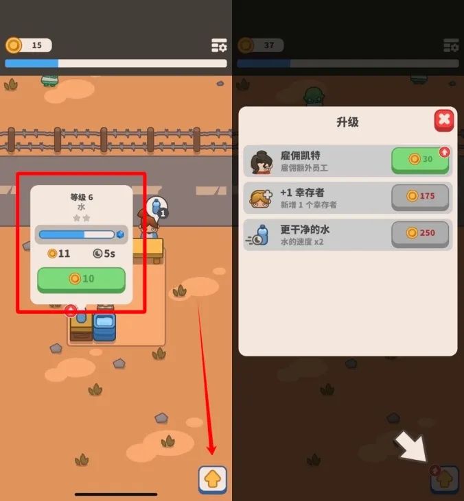 玩家可以升级生产装置(左 1 红框圈出),也可以升级基地(左 2 红色箭头指出),升级基地可以强化商品生产效率(图 2)| 图片来源:Idle Outpost